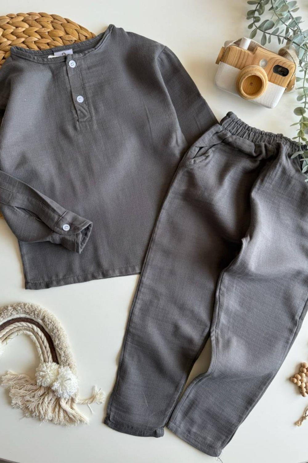 Erkek Çoçuk Keten Düğme Detaylı Antrasit Takım (MMK-0004)