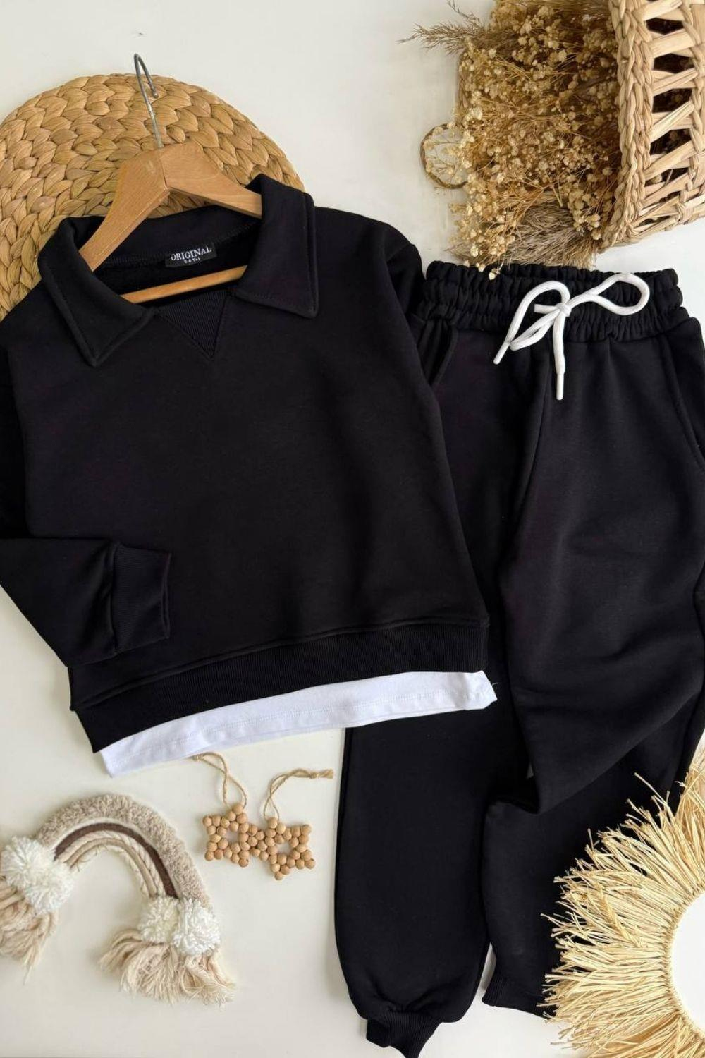 Unisex 3 İplik Gömlek Yaka Detaylı Siyah Takım (MMK-00209)